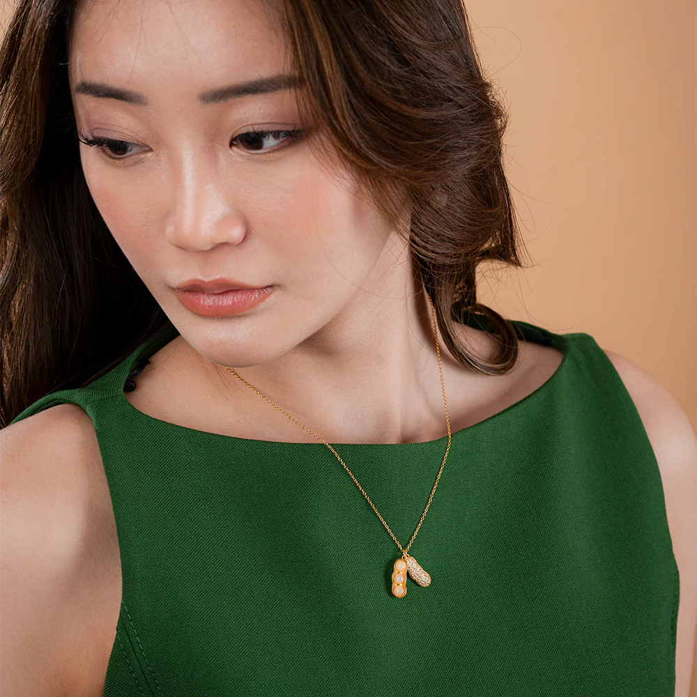 Blissful Harvest – Hetian Jade Collection Necklace Blissful Harvest adopts a peanut design with Hetian Jade as the seeds. Peanuts are believed to bring wealth and success, ensuring a prosperous year when included in Lunar New Year dishes. Their ability to grow and multiply symbolizes abundance and continuous growth. Also, peanuts are associated with good luck and fertility, making them common in weddings and celebrations as well wish gifts for newlywed couples.