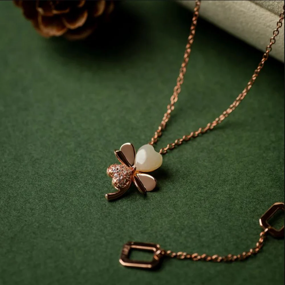 Fortuna’s Delight – Hetian Jade Collection Necklace Fortuna’s Delight exudes charm and elegance with its enchanting four-leaf clover design, featuring a captivating combination of Hetian Jade pieces and sparkling cubic zirconia stones. The four-leaf clover, steeped in symbolism, represents luck, prosperity, hope, and faith, making it a cherished emblem of good fortune and blessings.