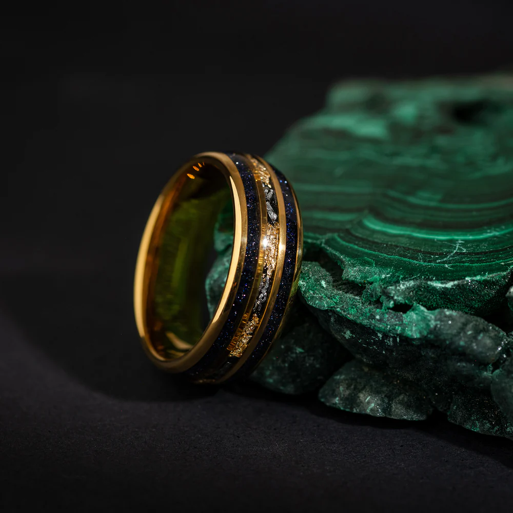 The Astral’s design captures the celestial journey of a meteor traversing through time and space, trailing a golden tail flame across the boundless deep space. Its complex yet simplistic design seamlessly combines meteorite metal, gold, and blue sandstone harmoniously on your finger.