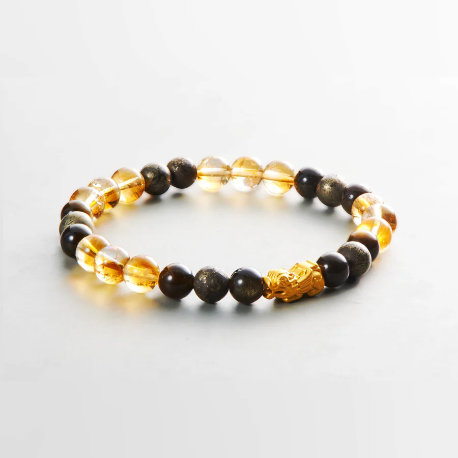 Shield yourself with strength and wisdom with The Aegis Pixiu Bracelet. Featuring Gold Obsidian for protection, Lavastone for grounding, and Gold Rutilated Quartz for clarity, this bracelet embodies resilience and empowerment. The 0.3g 999 Solid Gold Pixiu draws in prosperity, serving as a powerful guardian for the wearer. The Aegis is ideal for those who value protection, stability, and the pursuit of greatness.
