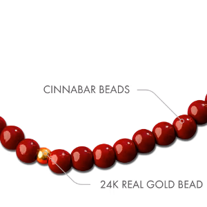 Each 4mm cinnabar bead on this exquisite bracelet is a testament to meticulous craftsmanship. Individually selected for its vibrancy and flawless surface, these polished spheres whisper ancient wisdom with every touch. Imagine sunlight catching their fiery red depths, igniting a spark of vitality within you. Interwoven with this vibrant symphony sits a gleaming 24k gold accent bead. Crafted with impeccable precision, it shines like a beacon of prosperity and abundance. Each bead is threaded on a durable yet supple cord, chosen for its strength and comfort. It drapes your wrist like a silken whisper, a second skin imbued with the whispers of harmony and fortune. Made from high-quality, tarnish-resistant metals, it holds The Radiance close, securing your connection to its blessings. And finally, the finishing touch: a polished protective seal adorns the bracelet’s end, ensuring its beauty and integrity for years to come.