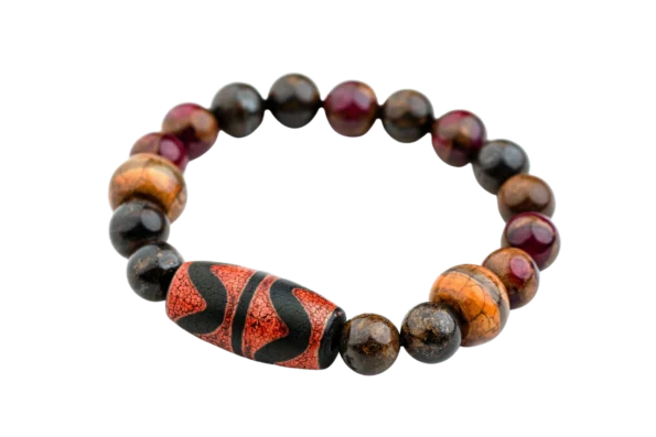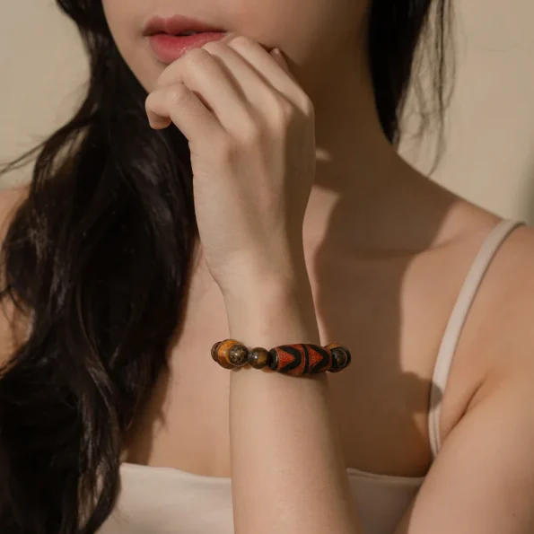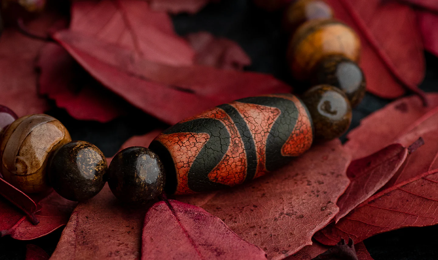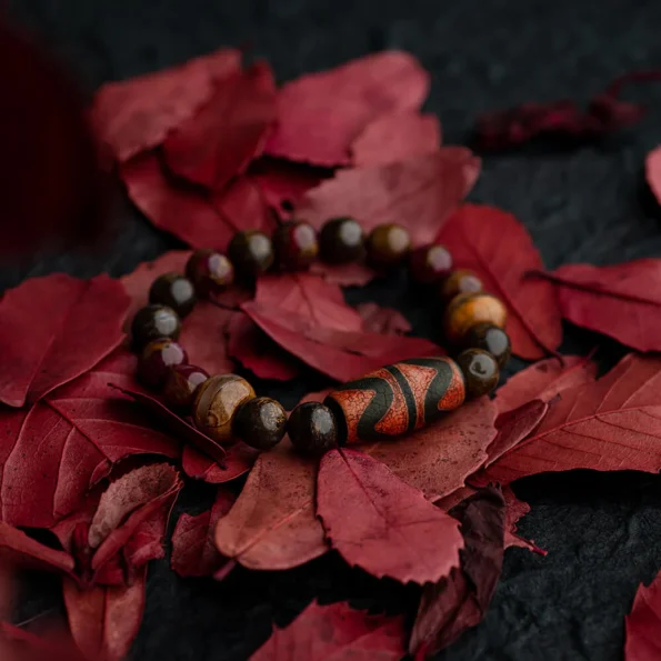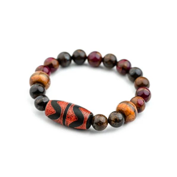 The Phoenix is a Tibetan Dzi Bracelet born of the Fire Element. An elegant and subtle combination of the Red Cloisonné stone, Copper Bronze paired with Heaven and earth and natural Agate Beads. The Phoenix protects your mind and helps in calmness of mind thereby acting as a protective stone to one’s Zodiac and Horoscope.