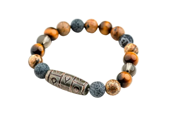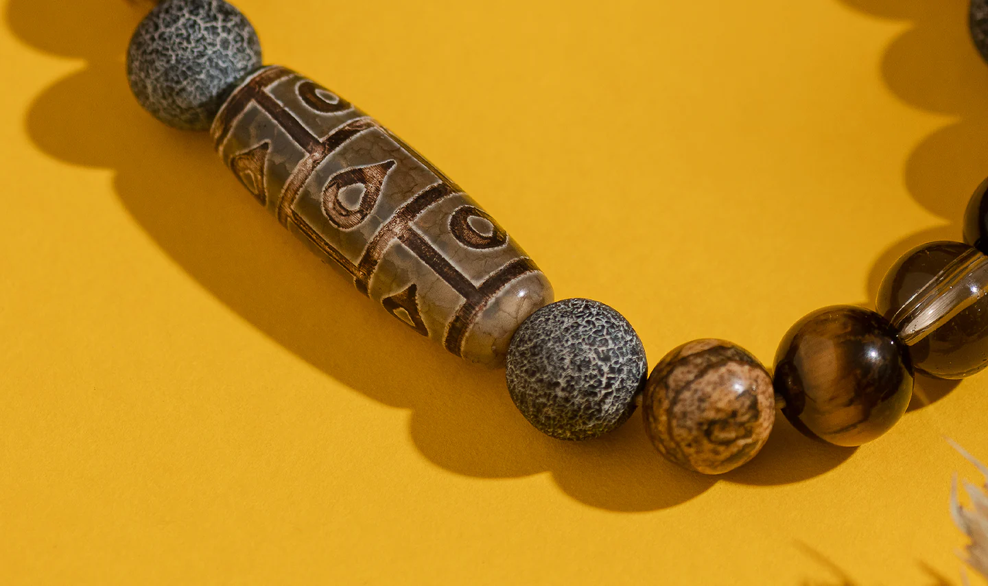The Aloha is a Tibetan Dzi Bracelet born of the Earth Element. An elegant and subtle combination of the Black Weathered stone, Jasper Beads paired with Fusion Tiger Eye with smokey Quartz Glass beads. The Aloha absorbs and transforms negative energies into positivity, improving Benefactor Luck to one’s Zodiac and Horoscope.