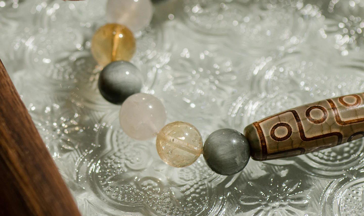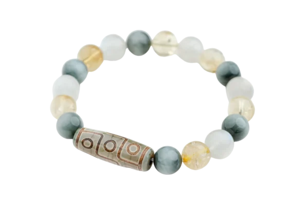 The Mosaic is a Tibetan Dzi Bracelet born of the Metal Element. An elegant and subtle combination of the Eagle eye, Citrine paired with Moonstone charms. The Mosaic focuses, elevates courage and purpose to its owners .The Mosaic is a powerful and courageous tool for increasing vitality and provides the benefactor luck thereby acting as a protective stone to one’s Zodiac and Horoscope.