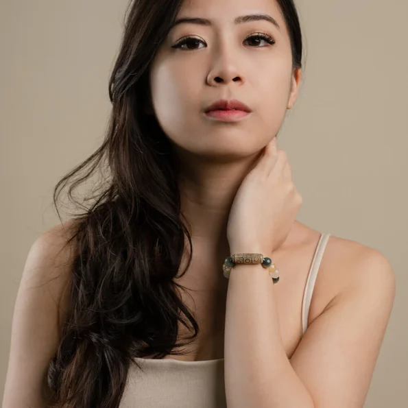 The Mosaic is a Tibetan Dzi Bracelet born of the Metal Element. An elegant and subtle combination of the Eagle eye, Citrine paired with Moonstone charms. The Mosaic focuses, elevates courage and purpose to its owners .The Mosaic is a powerful and courageous tool for increasing vitality and provides the benefactor luck thereby acting as a protective stone to one’s Zodiac and Horoscope.