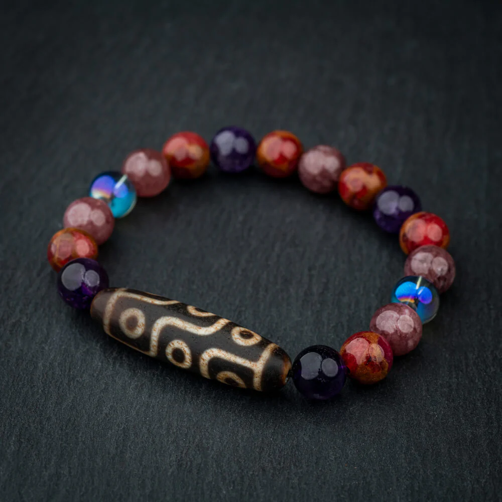The Stellar is a Tibetan Dzi Bracelet born of the Fire Element. An elegant and subtle combination of the Tibetan Red 1 Eye Dzi, Red Cloisonné stone, Lepidolite, paired with south African amethyst with Austrian crystals. The Stellar helps to transform negative thinking into positive thinking and the calmness of mind thereby acting as a protective stone to one’s Zodiac and Horoscope.