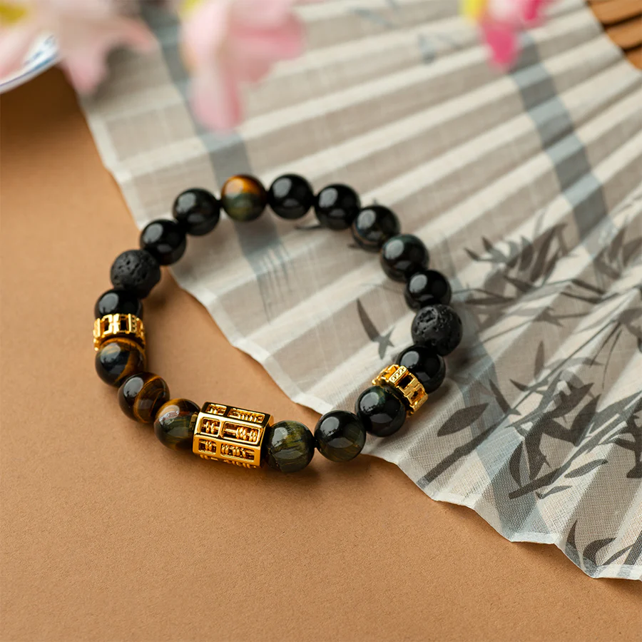 The triple abacus charms serve as steadfast companions, empowering you to navigate challenges with renewed confidence and resilience. Complemented by the harmonious energies of Blue Yellow Tiger Eye, Black Agate, and Lava Stone, this bracelet becomes a powerful talisman, aiding you in reclaiming your inner power and walking confidently on the path of prosperity.